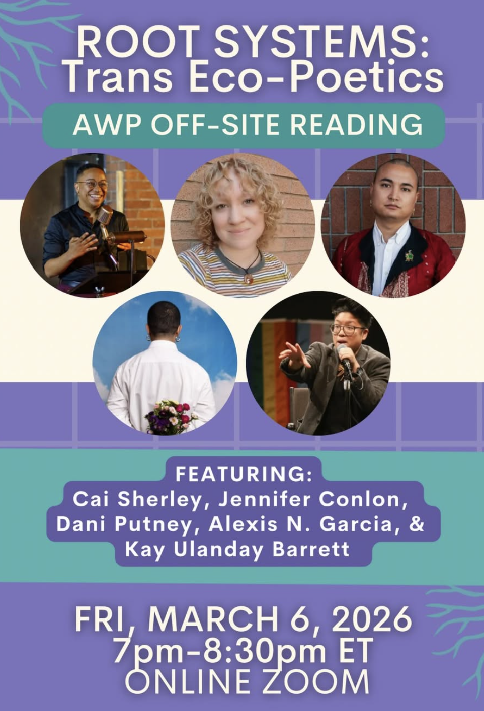 Join us for a complex and vibrant mix of eco-poetry and trans voices exploring roots, climate, and nature in a thoughtful virtual space.